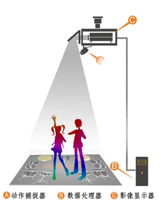 地面(或墙面)互动投影是运用红外线摄 像机采集点击的位置,由数据采集卡传输到电脑,通过 影像识别软件将物理坐标转换为计算机屏幕的逻辑坐标 及控制指令,信号再通过动感演示软件系统控制投影机 播放文件,并对应识别的坐标进行多媒体演示。它由演示地面(白色)传输演示硬件、互动播放控制软件、多媒体制作四部分组成。
