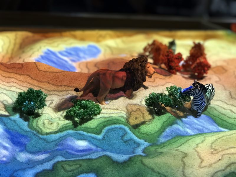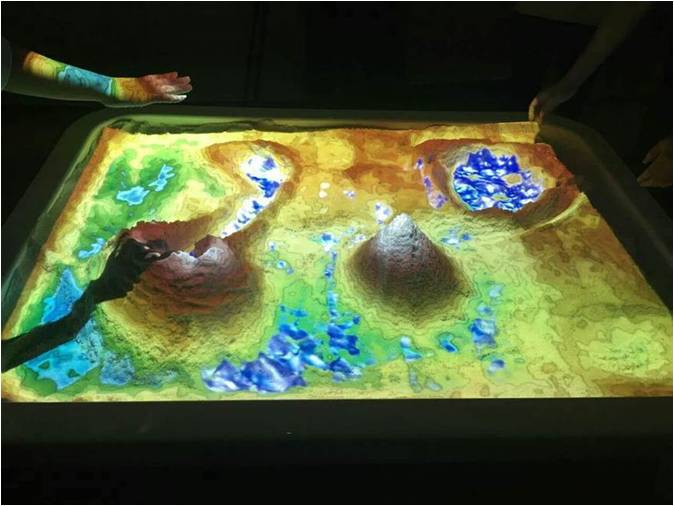 通过增强现实技术将沙盘投影和沙盒造型进行实景实时增强,使整个沙盘模型完全“活”了起来,它能模拟出沙盘区域的地形变化、火山河流等自然环境变化、一年四季的不同等。